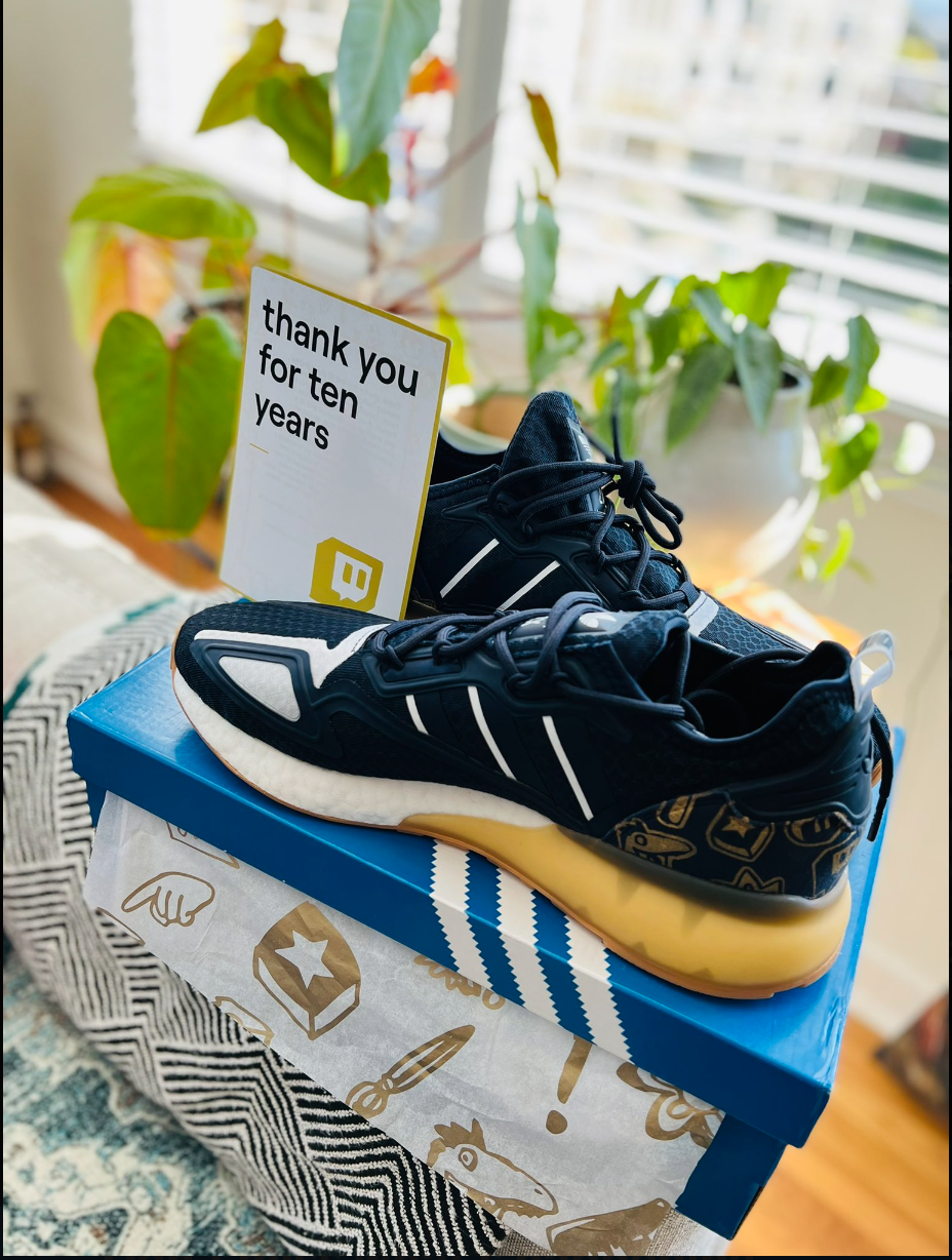 2500 pairs of the @adidasoriginals ZX 2KBoost. These shoes were gifted to each full time employee to celebrate their 10 year anniversary. Each shoe came with Twitch icons painted on the heel, custom tissue paper embellished with twitch icons and custom insoles